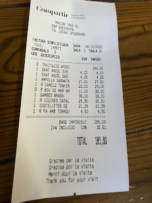 So, scoring the place is a little bit tricky. When it was good, Compartir was very, very good. And when it was bad, it was life-threatening. So in the end I suppose I’ll have to go for the midpoint between 10 and 1 and hope that if you ever decide to go yourself, you end up only ordering dishes that don’t threaten to put you in hospital. Maybe check with your waitress first, and if anything sounds like it might be a bittoogum-splitting, steer clear. As for me, well, I’ve done it now and don’t feel the need to go back, not with so many other lovely seafood restaurants in that part of the world for a lot less than €60pp. If you need me, I’ll be at the orthodontist.