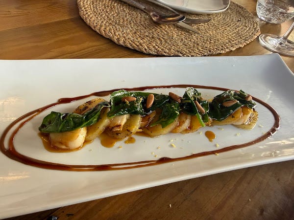Then next, roasted scallops with potato and spinach. Plump little slices of sweet scallops alternated with soft potato, topped with spinach, pine nuts and lemon zest (such is the Catalan way) and all of it soaked in a lovely glossy, meaty jus, it was another intelligent, beautifully presented course that showcased just how good this kitchen can be. It would have been the perfect end to the meal.