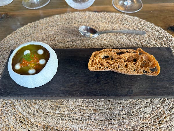 Crab and avocado was very nearly right. Plenty of fresh crab meat (plus a good amount of brown, always nice to see) and exquisitely presented, with dots of what I assume was a very light mayonnaise dancing around a generous dollop of roe. But there was something slightly off-putting about the texture of the avocado - it had been blitzed to within an inch of its life to a strange, characterless, cold avocado-flavoured cream which rather than complimenting the crab just ended up relying on it for seasoning and texture. Also - and I’m quite prepared to admit this is my own personal hill to die on - if you use a particular animal’s form to serve a dish, whether it’s a scallop shell or as in this case a ceramic sea urchin or anything else, it really should contain some element of that animal in the dish itself. And I don’t think there was any sea urchin in this. Or if there was, we couldn’t taste it.