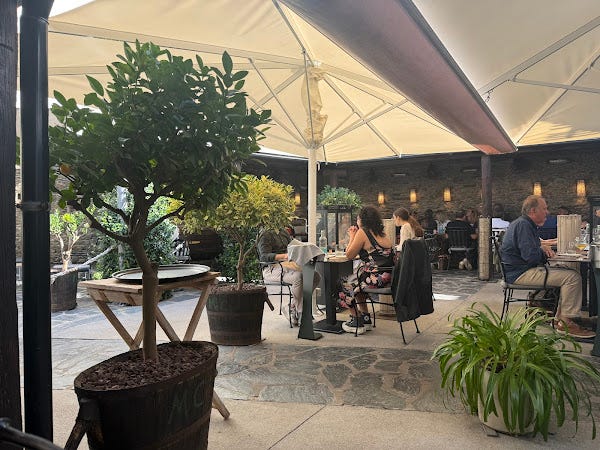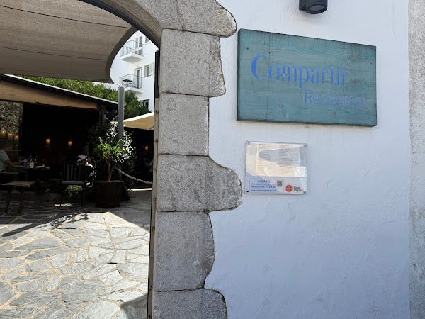 Compartir, a restaurant in the seaside village of Cadaqués, has lots going for it. The most obvious thing it has going for it is Cadaqués, a tourist town but not troublingly so, with its own unique identity - bohemian, somewhat eccentric, traditionally popular with artists and writers - and its own architectural style - grey slate walls, irregular oblong cobblestones and whitewashed narrow alleyways decked with bright purple bougainvillea.