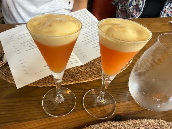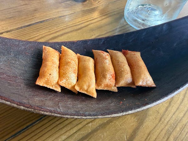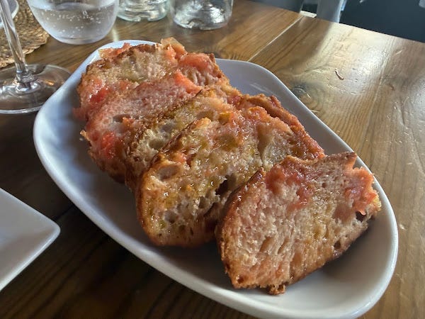 First thing to arrive on the table was a little house aperitif of orange juice and Campari. It tasted a little subdued - any fresh juice from any number of coffee shops in the area would have had a stronger hit of orange - but was a nice enough gesture given it was free. Alongside were a little row of pillow-shaped crackers dusted with tomato powder, and again they didn’t taste of much considering the effort that had clearly gone into them - the cracker would have been like cardboard on its own, and there wasn’t enough tomato powder - or it wasn’t strongly flavoured enough - to offset the bland cracker.