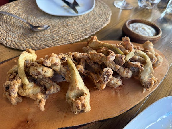 Because we really, really should have stopped there. In my defence though, “Breaded fried rabbit ribs and artichoke with apple Aioli” sounds like it might be nice, doesn’t it? In my mind I was imagining a painstakingly French-trimmed rack of rabbit ribs, lovingly rolled in herb breadcrumbs, roasted and served sliced into little cute rabbity lollypops. What arrived was essentially fried rabbit bones, with so little meat on them to make the effort of attempting to find some under the opaque breadcrumb coating a distressing chore, none of it seasoned properly and the whole affair feeling like some kind of elaborate practical joke played on gullible foreigners. We pointed out the complete inedibility of this dish to a waitress.