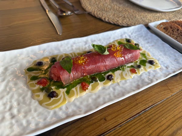 Fortunately Compartir found its feet with the first course proper, a tuna “cannelloni” (tuna tartare rolled up into a neat tube) surrounded by a colourful and cleverly patterned sauce of olives, capers, various herbs and who knows what else, topped with trout roe. This was genuinely inventive and genuinely lovely, the tuna never overwhelmed by the other flavours on the plate and all the ingredients clearly of very high quality, treated well. This is apparently a Compartir signature dish, and you can really see why - it was a real highlight.