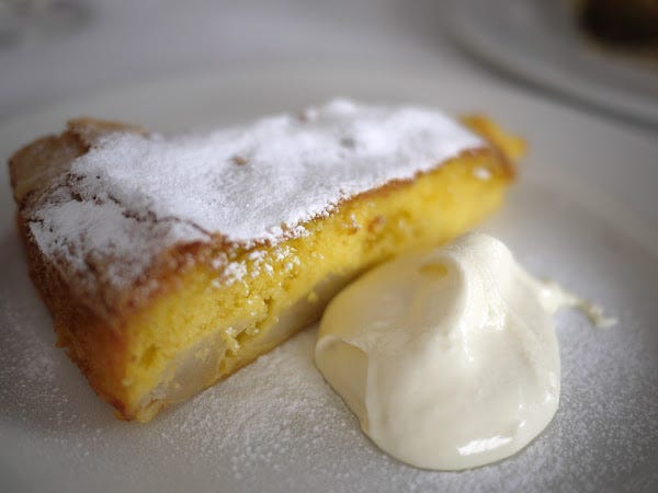 We never wanted lunch to end, and so ordered three out of the four sweets on offer. Apple tart was warm and soft and moist, with generous chunks of sweet poached apple and a nice sharp dollop of crème fraîche (or whatever the Italian equivalent is, sorry Italians) on the side.