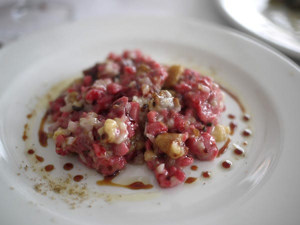 Steak tartare avoided many of the pitfalls of lesser versions by being properly seasoned and containing nice big chunks of soft lardo. But the unexpected twist in this dish was the addition of toasted walnuts - and very good walnuts too, not the horrid bitter ones you get in British supermarkets - providing an extra texture and buttery nuttiness. It all added up to one of the better raw beef dishes I've enjoyed in years.
