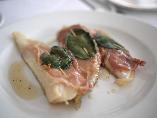 Wikipedia tells me that saltimbocca is a dish of sage-and-prosciutto-wrapped veal, although thanks to London's seemingly endless capacity to never do what it's told I've had pigeon, guinea fowl and chicken versions of the dish in the past but never veal. Anyway I now have lemon sole saltimbocca to add to the list, and can confirm it works incredibly well, the dense, meaty flesh of the (again, meticulously deboned) sole seasoned and complexified by the ham and sage. Maybe one day I'll try the veal. I bet it won't be as good.