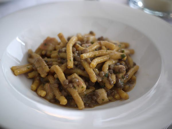But if the ragù was excellent, this bowl of passatelli with lentils was close to life-changing. Lentils make a superb ingredient in a pasta dish, their vaguely soily, fatty texture binding together the pasta and the other ingredients to make hugely a satisfying bite. But the touch of genius here was the addition of red mullet broth, a powerfully-flavoured fish that can often, in the wrong hands, be a bit too fishy, but as a seafood stock used to infuse pasta and lentils made for heady, salty, seafood perfection. I've honestly never eaten anything quite like it.