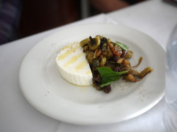 Next up, a silky-smooth slice of excellent sheep's milk ricotta alongside a deeply-flavoured caponata. It still seems strange, as a meat-eater, describing a vegan dish (I mean the caponata, not the cheese of course) as deeply-flavoured but as is often said, the best vegan dishes are vegan because they're supposed to be made like that, and aren't just vegetarian or meat or fish dishes with the dairy or protein taken out (or - worse - replaced with ultra-processed vegan alternatives). I am now a committed caponata fan.