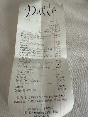 If I was finding it hard to criticize anything about Dalla, then that wasn't about to change with the arrival of the bill. With plenty of wine, more than enough food - all of which was unimprovable - and including service that never put a foot wrong, the cost per person was £72. I'm so used to being shocked at the price of eating out in London in a bad way that the pleasant surprise of being nearly £30 under my contactless limit was a rare and precious thing indeed.