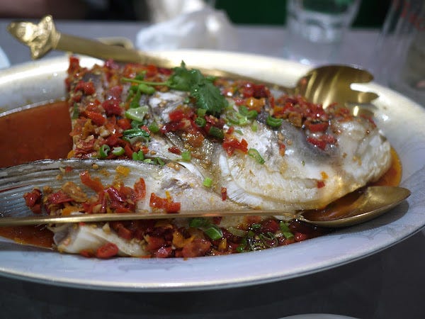 Finally, a Hunanese speciality of steamed fish heads with chopped chilli - powerfully spicy, perfectly cooked with an interesting gelatinous texture that brought to mind that Basque dish pil-pil. Despite being more stuffed than a large char siu bao by this point we were very reluctant to stop eating until every last bit of cheek and collar had been found and consumed. Alas, we weren’t completely successful but we didreallywell (our servers kindly told us).