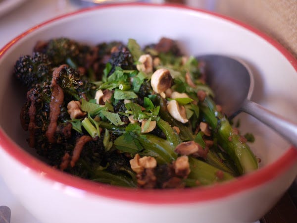 And finally from the savoury courses, a side of purple sprouting broccoli sporting yet another good bit of salty charring, and a nice hit of miso in the dressing. Vegetarians (and even vegans) would do very well here.